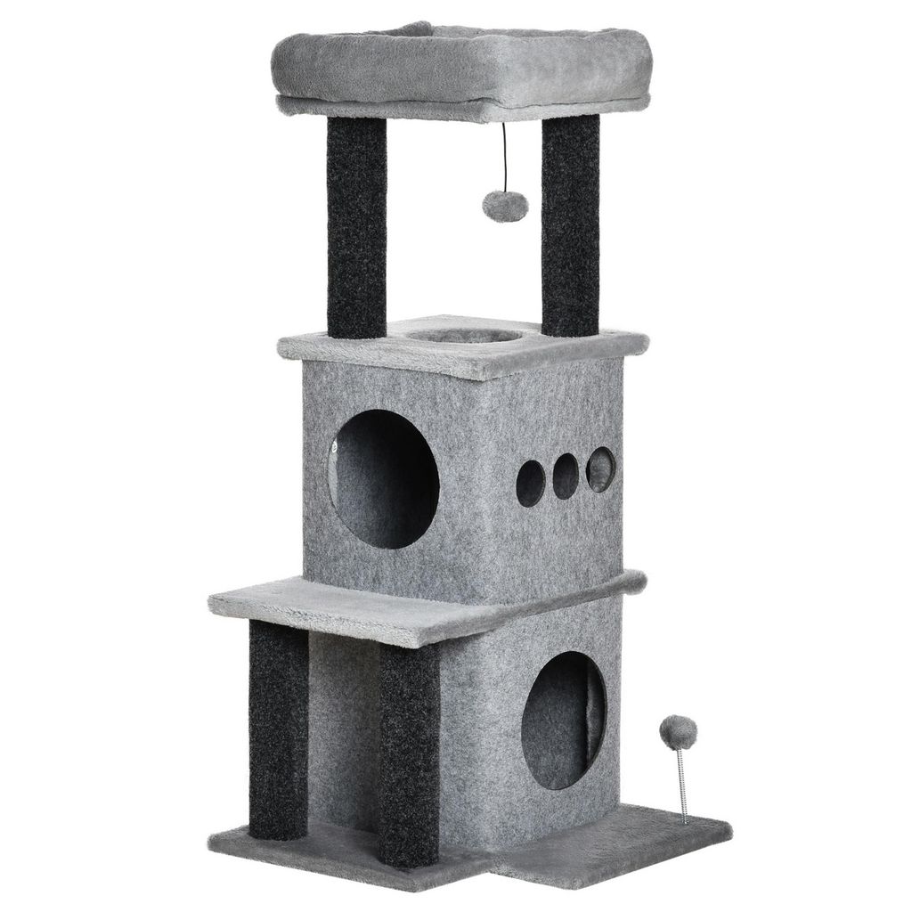 Arbre à chat centre d'activités griffoirs jeu boule suspendue et à ressort 2 niches housses amovibles plateformes gris