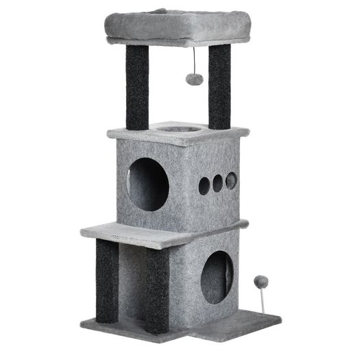 - Multi-équipement : 2 grandes niches avec housses amovibles, 4 plateformes dont une grande et haute d'observation, jeu de boule suspendue et boule à ressort, griffoirs