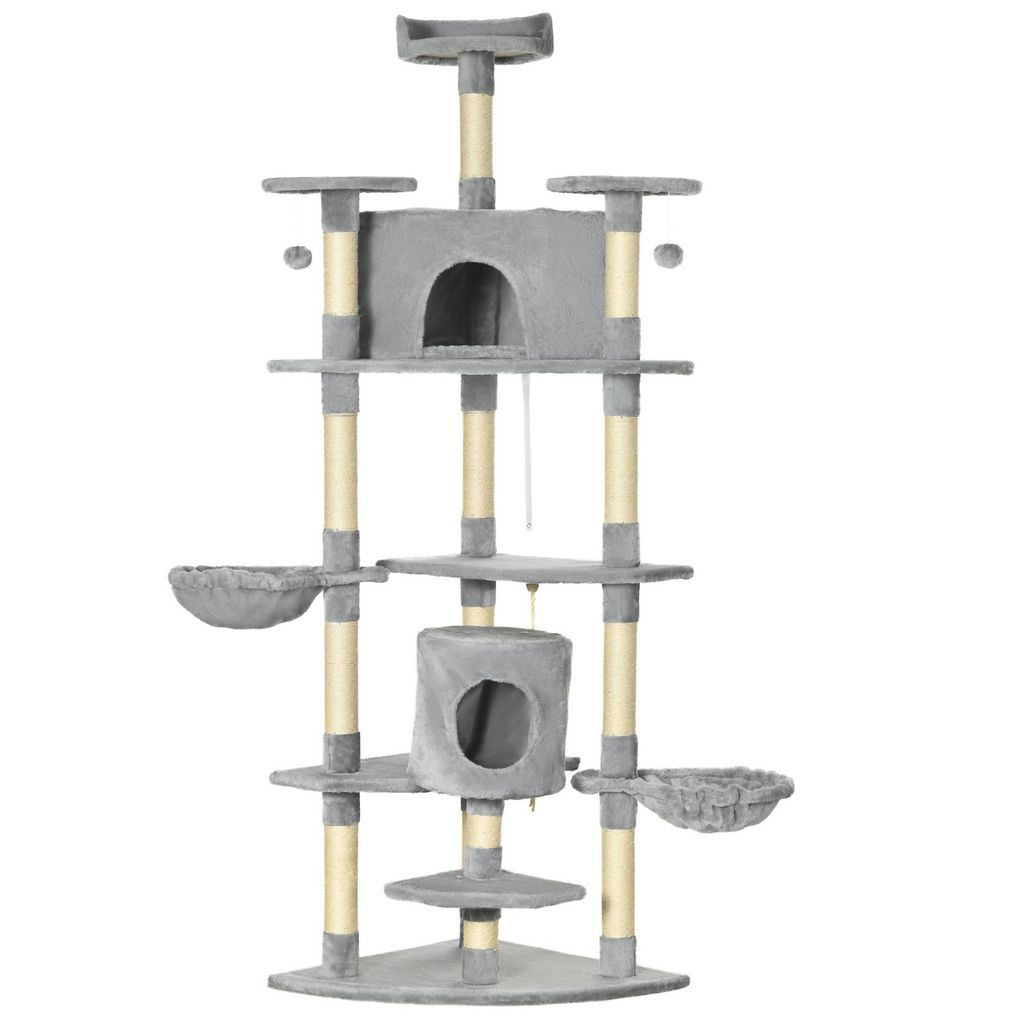 Arbre à chat multi-équipement griffoirs 2 niches 2 hamacs plateformes boules suspendues corde peluche grise