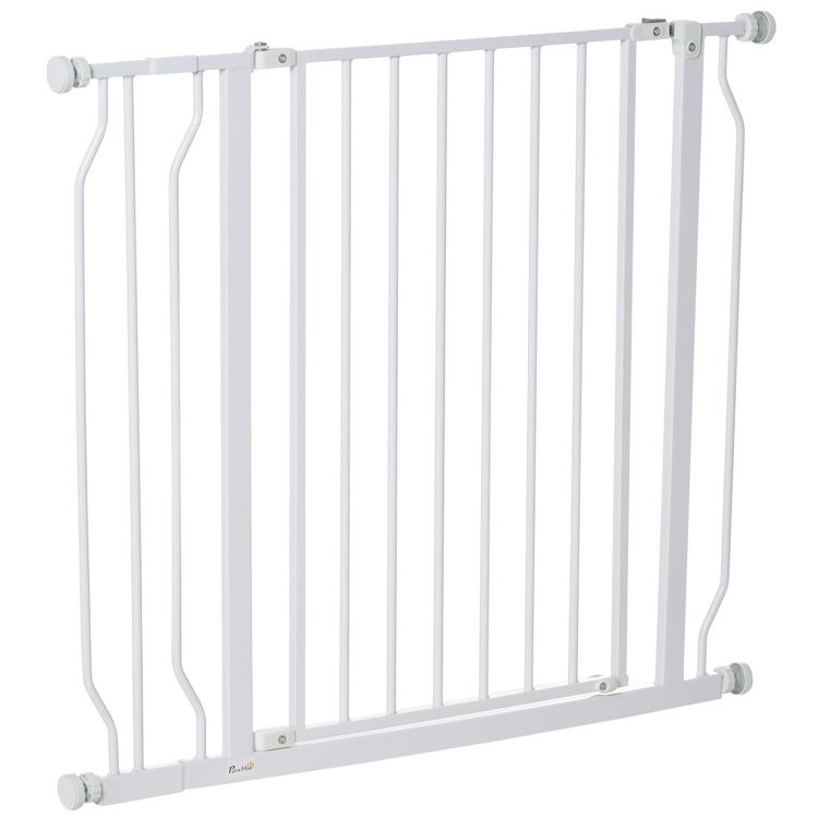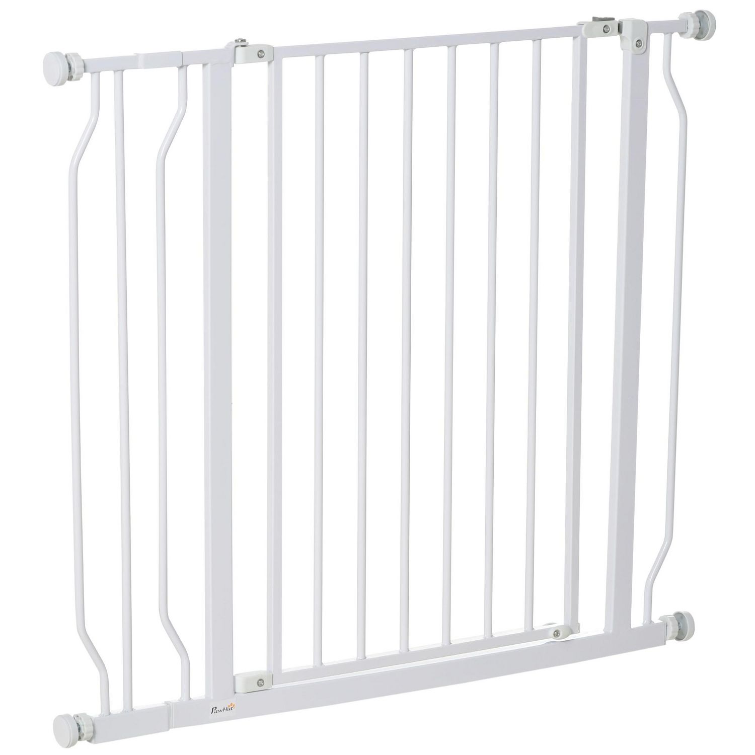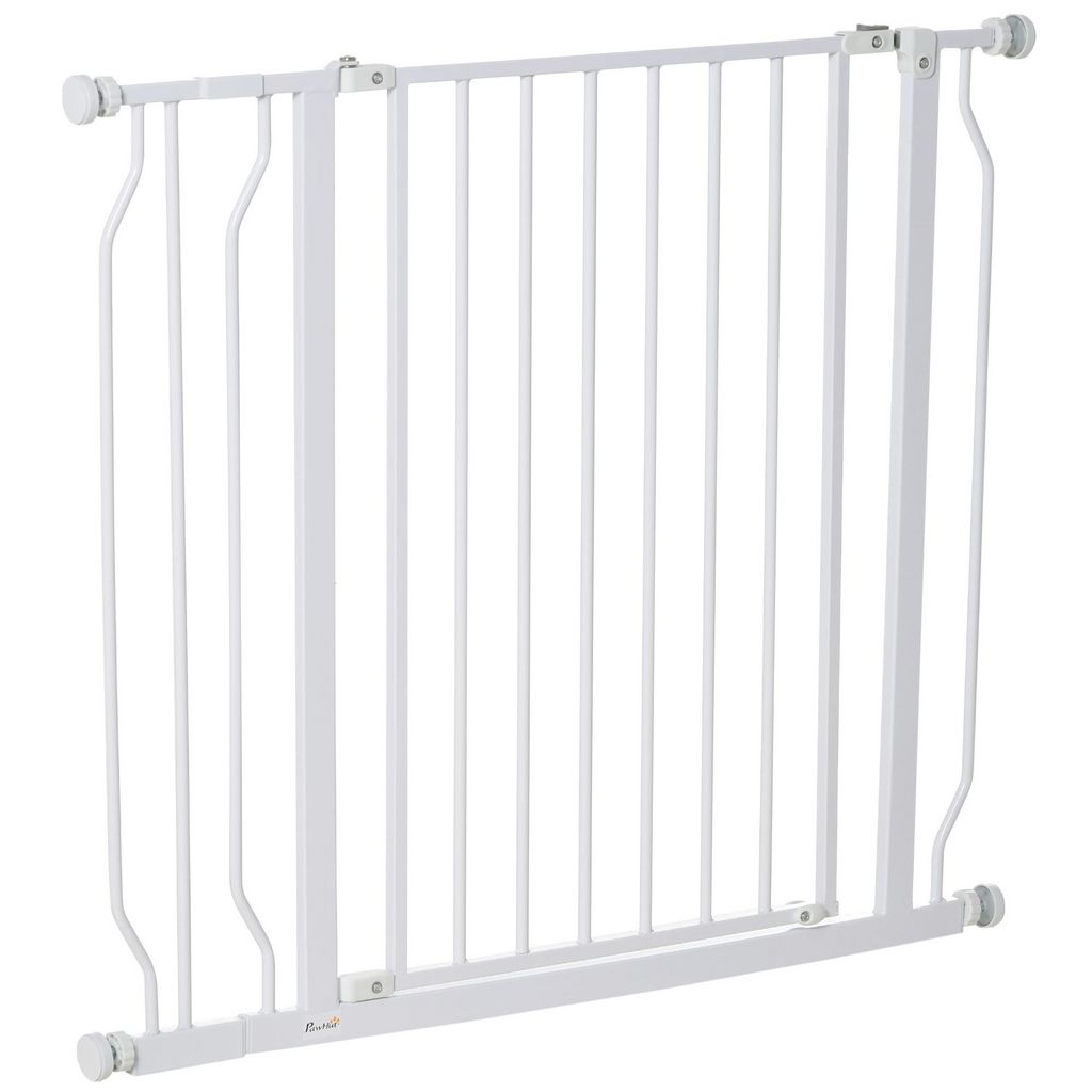 Barrière de sécurité animaux - longueur réglable dim. 75-95 cm - porte double verrouillage, ouverture double sens -sans perçage - acier ABS blanc