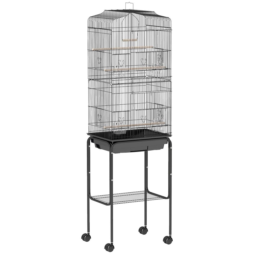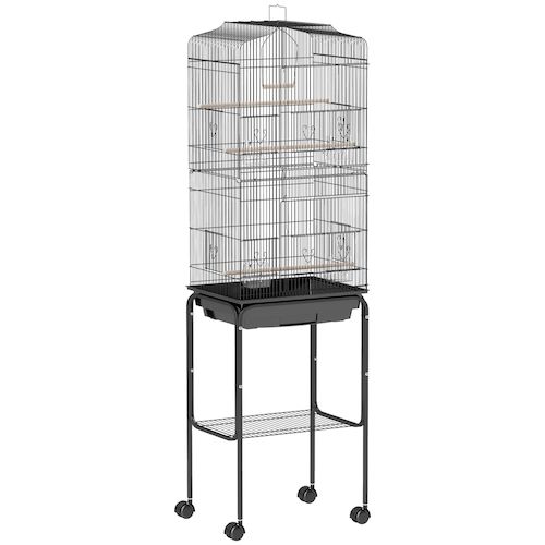 Cage à oiseaux sur pied volière mobile toit ouvrant 3 perchoirs étagère 46 x 36 x 157 cm
