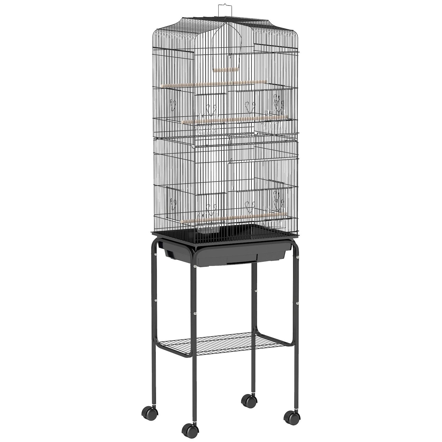 Cage à oiseaux sur pied volière mobile toit ouvrant 3 perchoirs étagère 46 x 36 x 157 cm noir