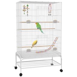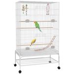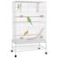 Cage à oiseaux sur roulettes - étagère, plateau déjection, 3 perchoirs, 4 mangeoirs, 2 portes, 8 trappes, accessoires - acier blanc