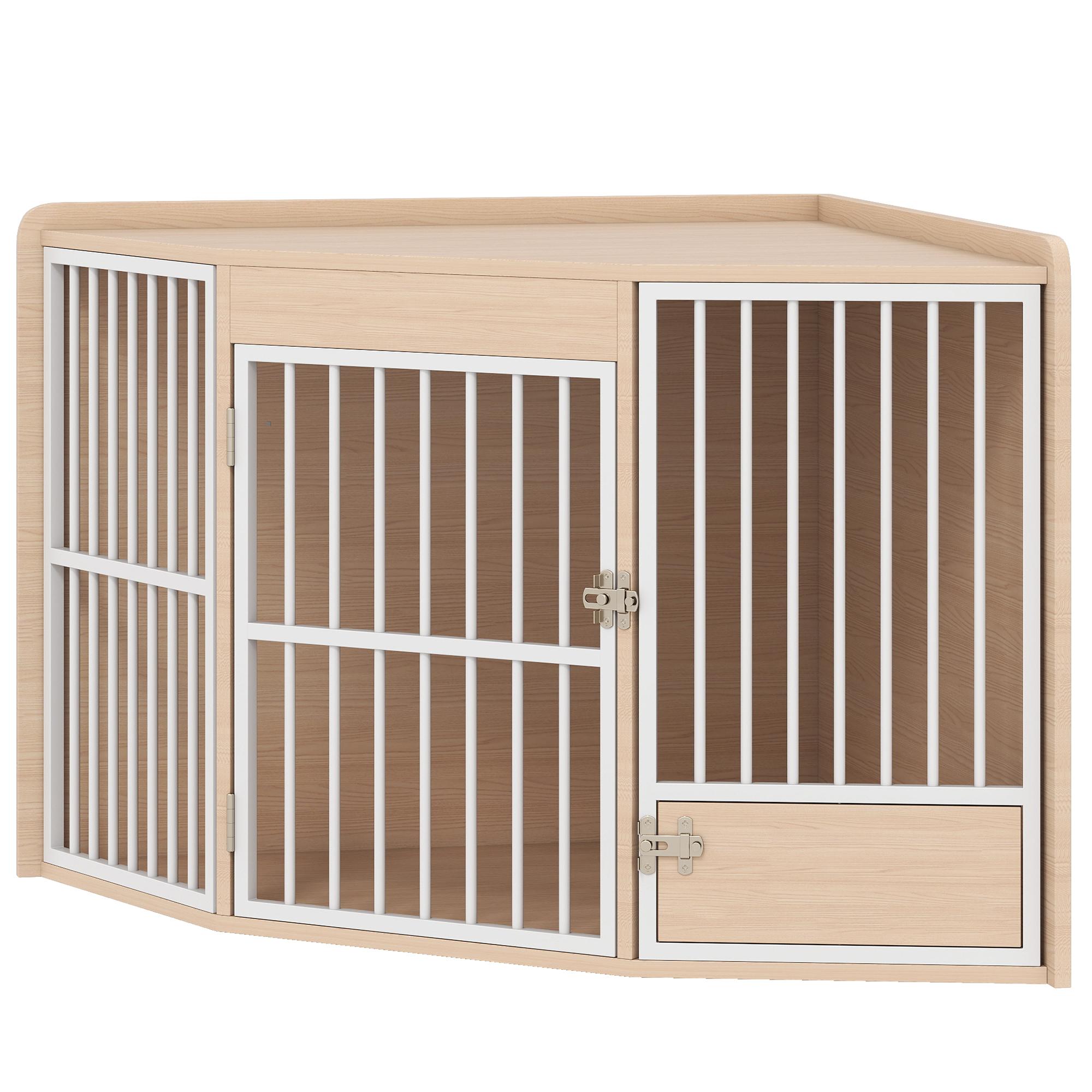 Cage d'angle pour chien en bois clair dim. 113 x 80 x 64 cm porte entrée + porte rotative alimentation