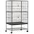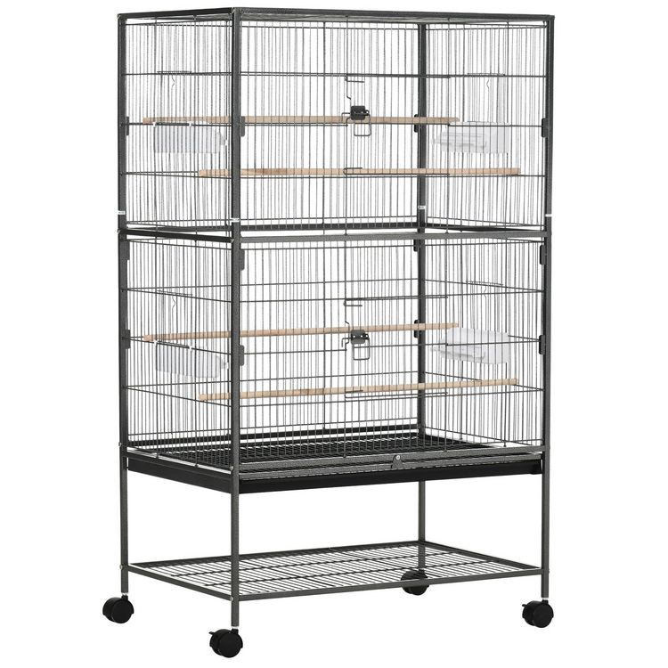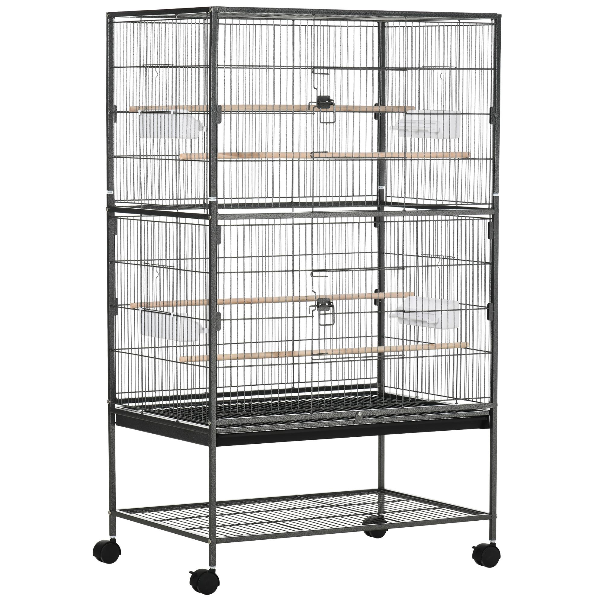 Cage oiseau mobile dim. 78x52x132cm - 4 perchoirs, mangeoires, plateau déjection, étagère - acier époxy gris moucheté