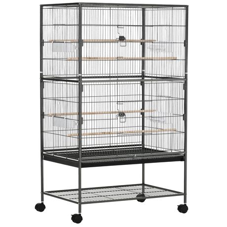 Découvrez cette cage à oiseaux PawHut, parfaite pour l'épanouissement des oiseaux, avec quatre perchoirs en bois et bacs en plastique pour faciliter l'alimentation. Accès aisé via deux portes frontales et quatre latérales pour vérifier eau et nourriture. Nettoyage simplifié par un plateau coulissant