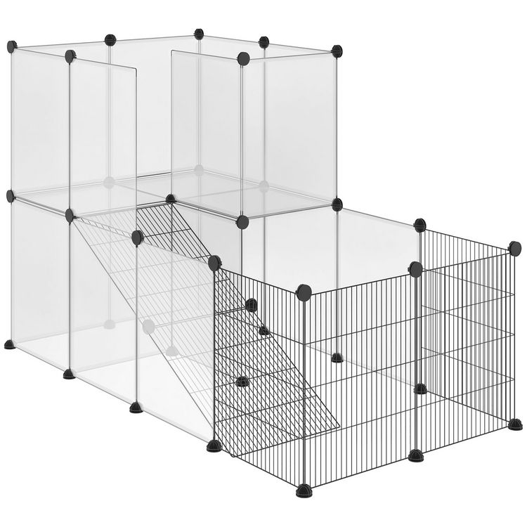 Cage parc enclos modulable rongeurs 2 niveaux 27 panneaux fil métallique noir PP transparent