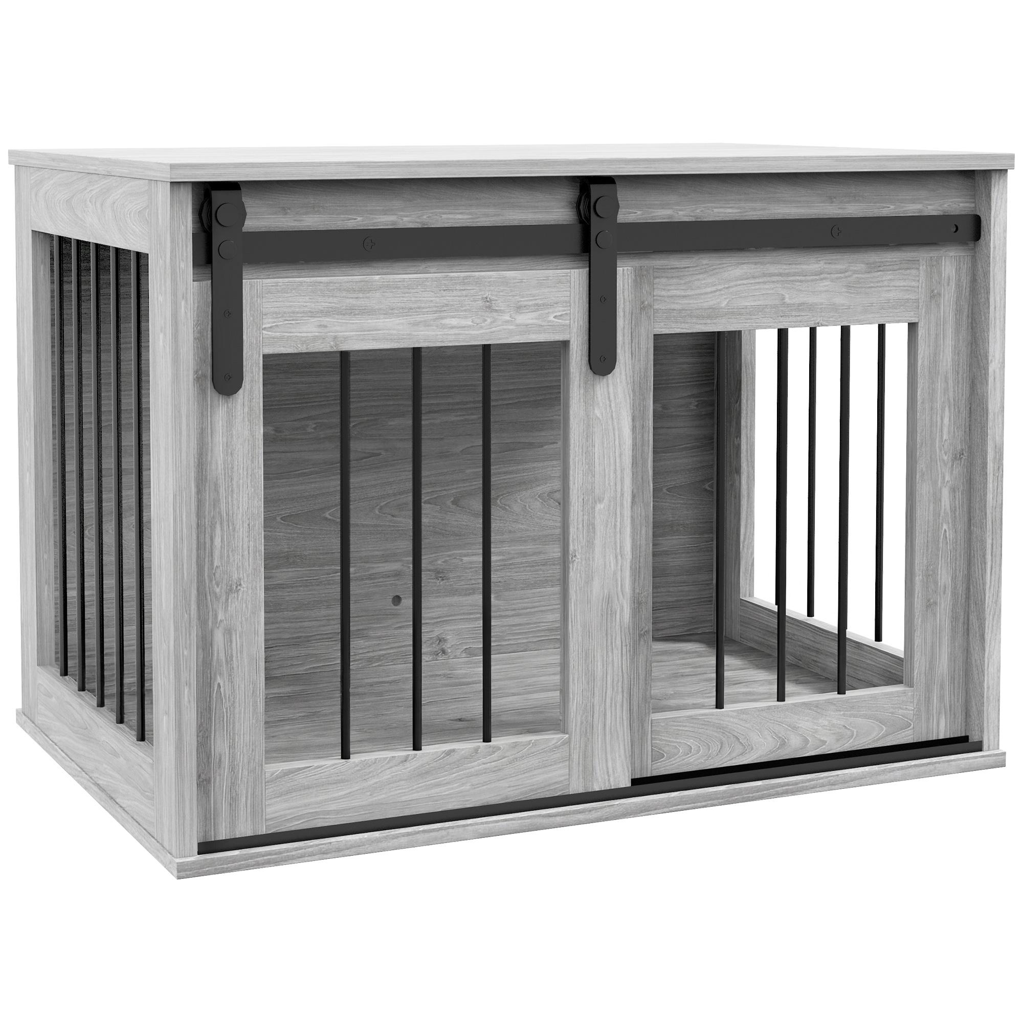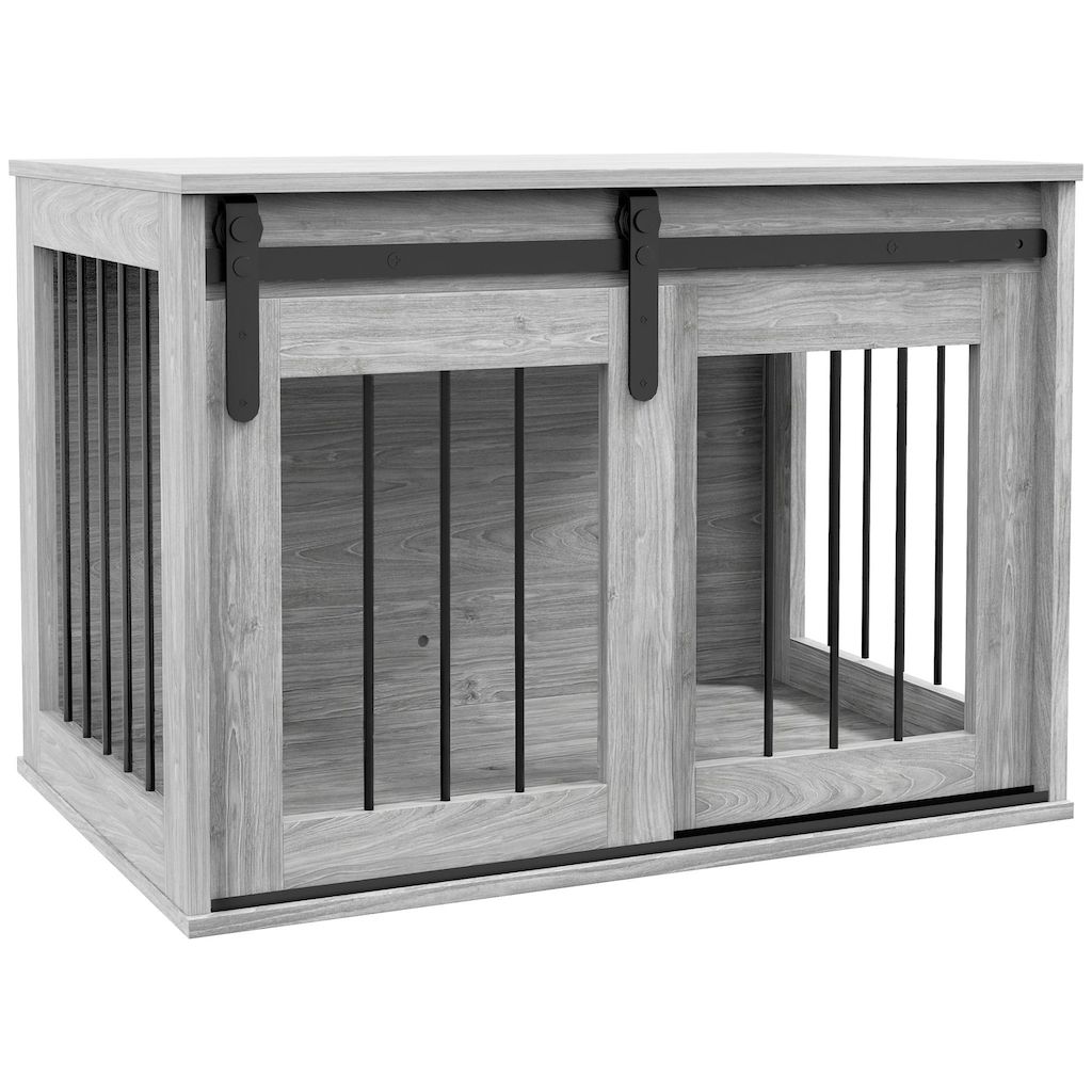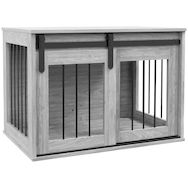 Cage pour chien animaux style industriel - porte coulissante verrouillable - acier noir aspect bois gris