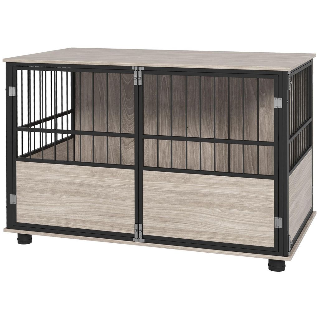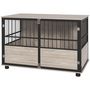 Cage pour chien animaux style industriel - porte coulissante verrouillable - acier noir panneaux aspect bois