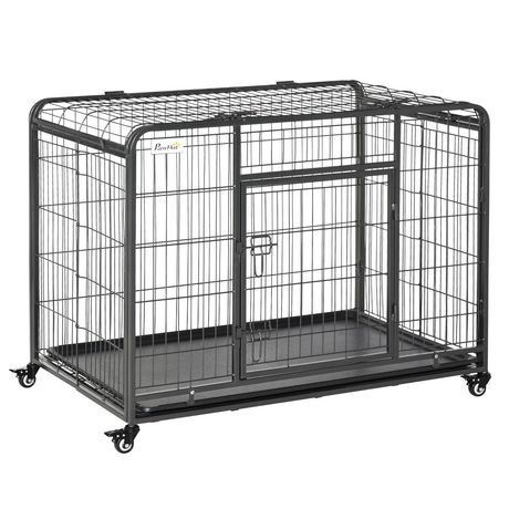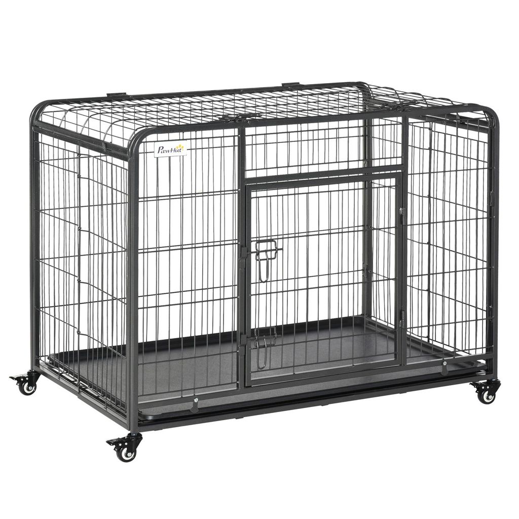 Cage pour chien pliable cage de transport sur roulettes 2 portes verrouillables plateau amovible dim. 109,5L x 71l x 78H cm métal gris noir