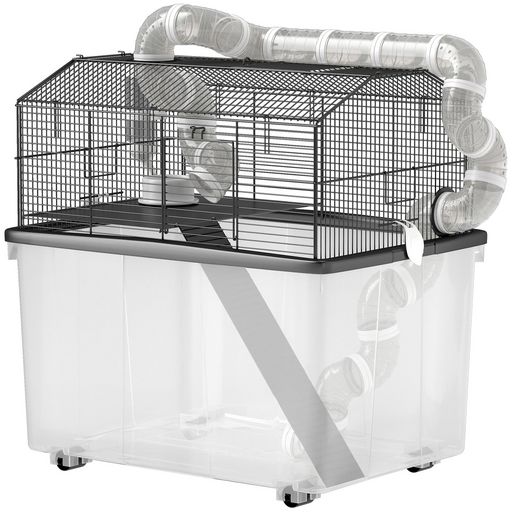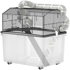 Explorez la Cage pour hamster PawHut, deux niveaux avec tubes pour aventures infinies. Plateau de 31 cm pour un espace propre et amusant, inclut perchoir, rampe, bouteille d'eau et gamelle. Idéale pour hamsters nains ou gerbilles, facile à déplacer avec des roues pratiques.