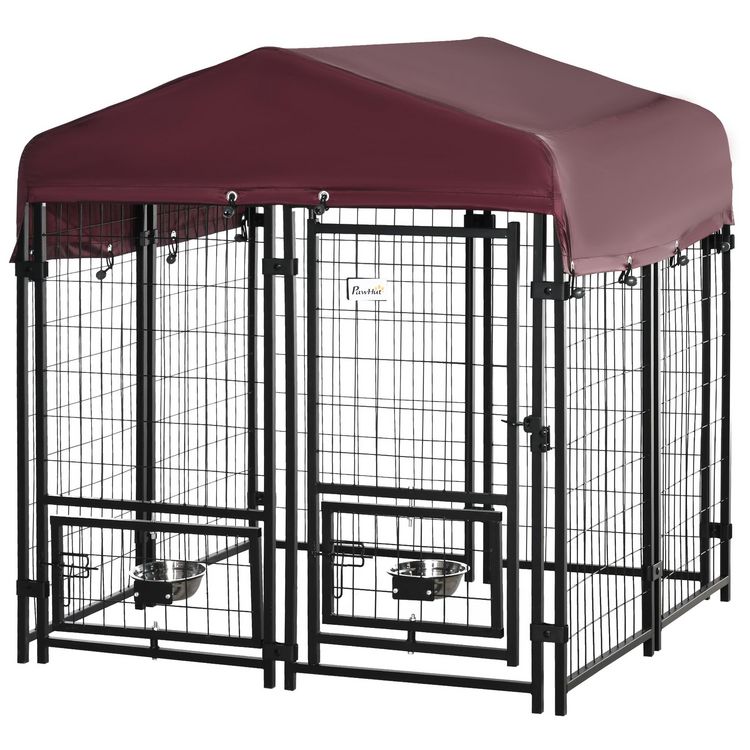 Chenil extérieur pour chien - cage chien - enclos chien - toile toit imperméable anti-UV, porte verrouillable, 2 bols rotatifs - acier noir oxford pourpre