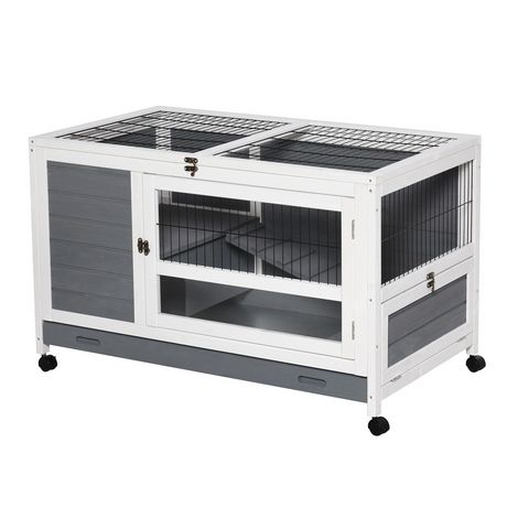Clapier à lapin sur roulettes cage à lapin 2 niv. 2 portes verrouillables toit ouvrant plateau coulissant rampe bois gris blanc