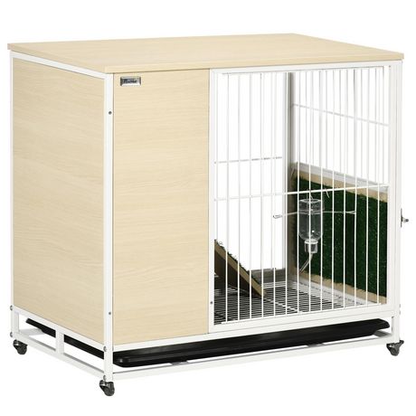 Clapier à lapin sur roulettes cage à lapin 2 niveaux toit ouvrant porte plateau déjection coulissant rampe niche acier blanc aspect bois clair