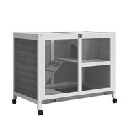 Clapier à lapin sur roulettes cage à lapin 2 niveaux toit ouvrant verrouillable plateau déjection coulissant rampe niche bois de sapin gris blanc