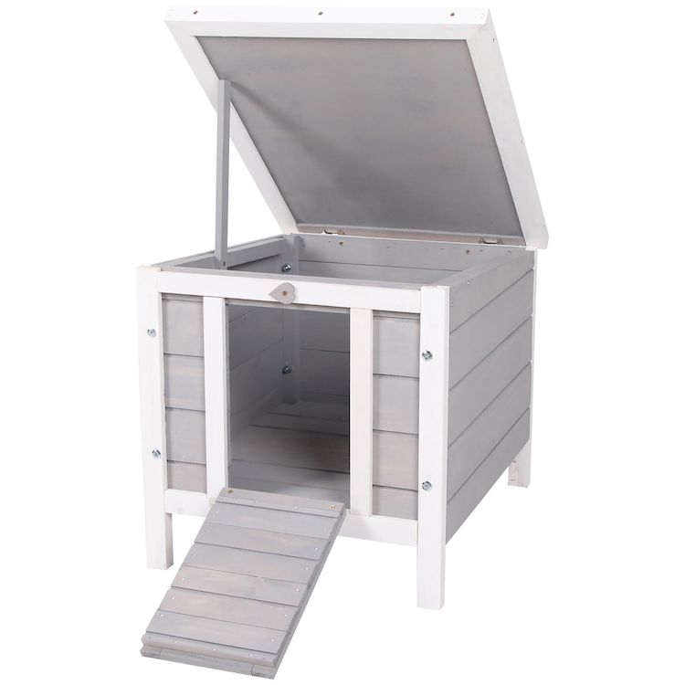 Clapier lapin niche sur pied - rampe porte verrouillable, toit ouvrant bitumé incliné - bois gris blanc