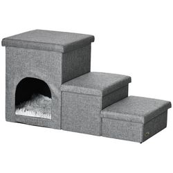 Escalier pour chat chien niche coffre 3 en 1 - 3 marches, coussin inclus - revêtement tissu rembourré doux - structure MDF - gris
