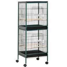 Grande cage à oiseaux sur pied à roulettes - volière double, mangeoires, perchoirs, plateau amovible - vert noir