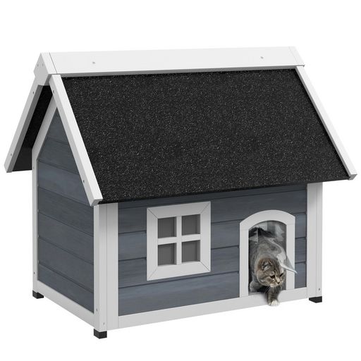 Niche maison pour chat - porte à lamelles, fenêtre plexiglas, toit bitumé ouvrant, 3 portes - bois gris