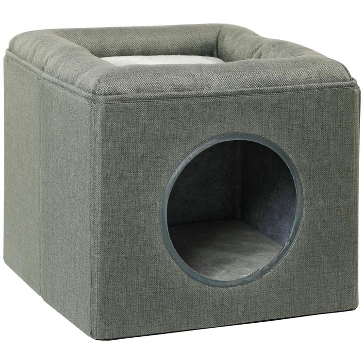 Panier chat pouf 2 en 1 - coussin amovible lavable - MDF PVC tissu aspect lin vert de gris
