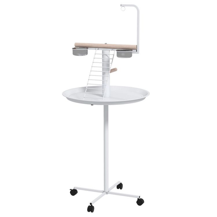Ce joli perchoir sur pied est spécialement adapté pour les grandes perruches et les perroquets. Monté sur 4 roulettes (dont 2 avec frein), il est facile à déplacer. Avec sa structure en acier, ce perchoir mobile est stable et dispose de 2 perchoirs, de 2 mangeoires, d'une échelle et d'un plateau en