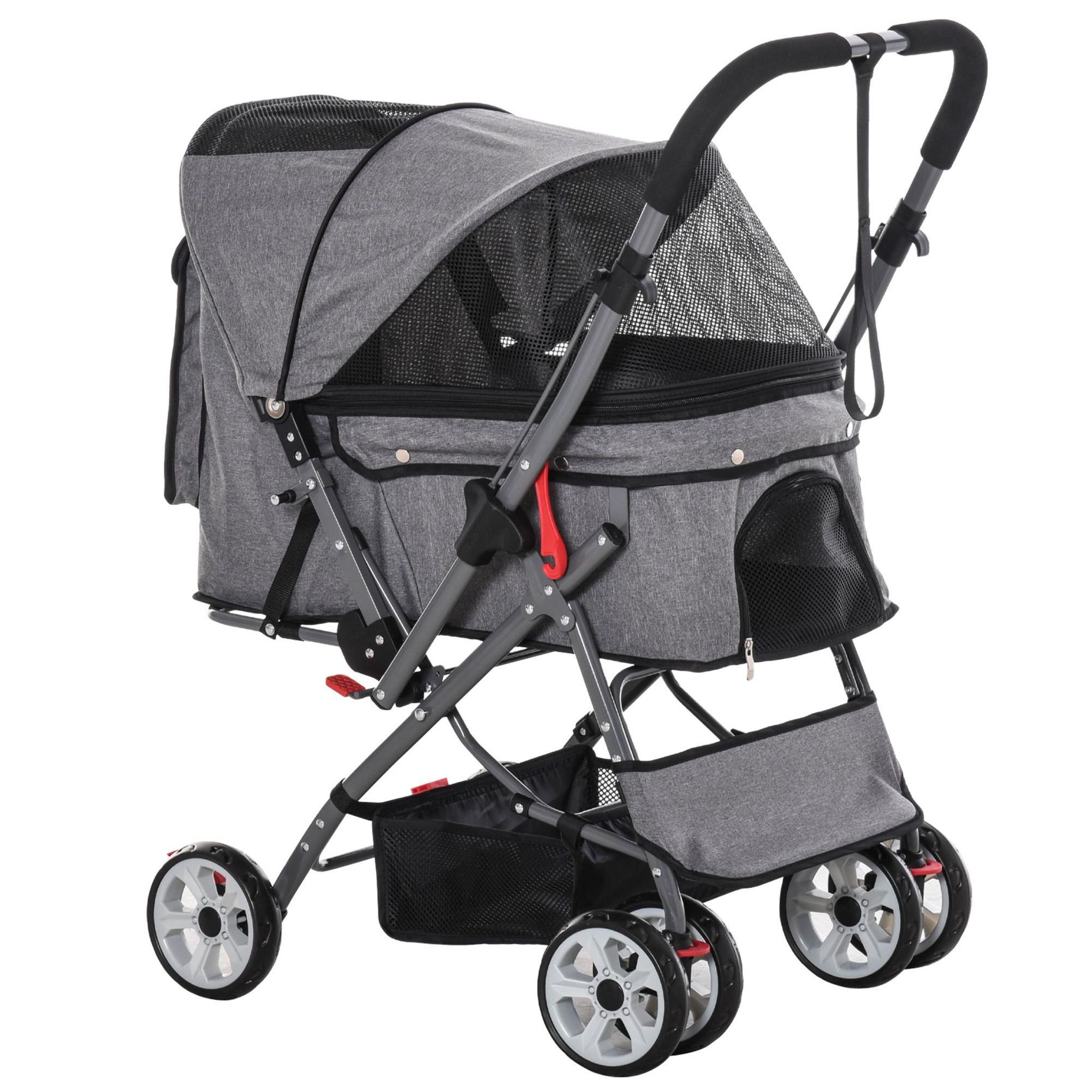 Poussette buggy pliable chien chat panier et sac de rangement attaches sécurité housse réglable poignée réversible acier Oxford gris chiné noir
