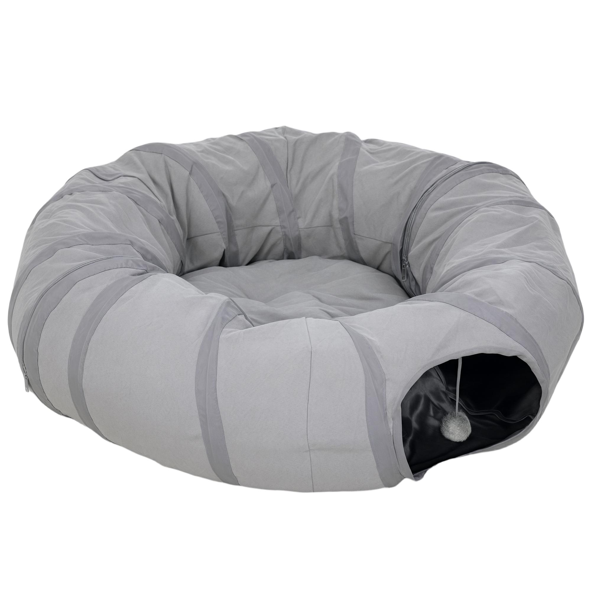 Tunnel pour chat intérieur - fonction lit pliable avec coussin et jeu balle suspendue - gris