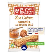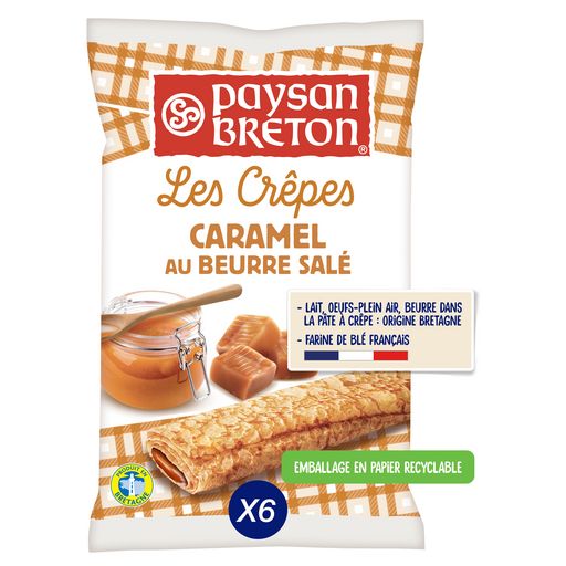 Ingrédients : Crêpes (60%) : farine de BLE (33%)*, LAIT frais pasteurisé (23%)*, sucre, OEUFS entiers pasteurisés*** (15%)*, BEURRE frais (5,6%)*, dextrose, sel. Caramel au beurre salé (40%) : sirop de glucose-fructose, LAIT concentré sucré, BEURRE salé (22%)**, sucre, eau, sel , épaississant : pectine de fruits *pourcentages exprimés sur la crêpe ** pourcentage exprimé sur le fourrage *** oeufs de poules élevées en plein air Traces éventuelles de fruits à coque et de soja