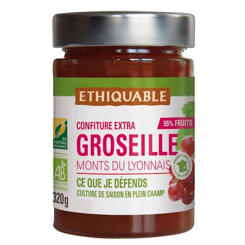 CE QUE J'AIME : L’intensité acidulée d'une groseille de terroir. Cette confiture extra, bio et équitable, 100% Monts du Lyonnais, est une tentation à laquelle on cède volontiers. Parce qu’elle est préparée avec des groseilles cultivées en pleine terre, en saison, sans serre chauffée ni culture hors-sol. Parce qu’elles sont récoltées à la main à parfaite maturité, pour offrir toute leur fraîcheur acidulée. Parce que la transformation est réalisée sur place, dans l’atelier des producteurs, selon un savoir-faire artisanal. Et parce qu’elle contient 55% de fruits, pour un goût intense, naturel et authentique. Une confiture qui reflète toute la richesse d’un terroir d’exception, entre Loire et Rhône.