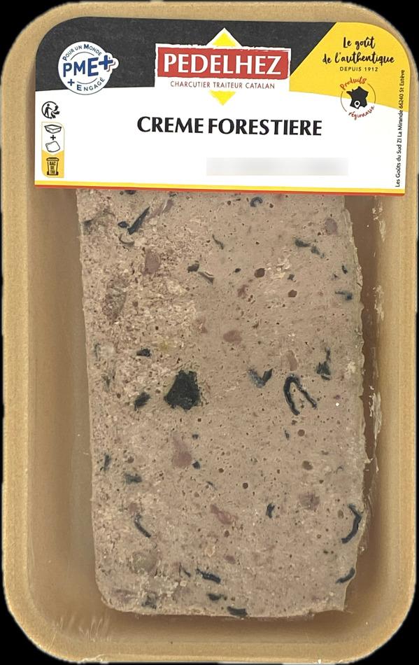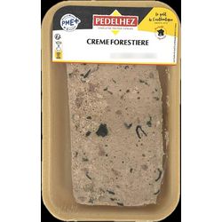 gras et foie de porc, eau, couenne, champignons sylvestres réhydratés (3,5%), sel, farine de riz, fécle de pomme de terre et amidon de manioc, épices et plantes aromatiques, saccharose, arômes naturels, conservateurs E301 et E250, colorants E120.