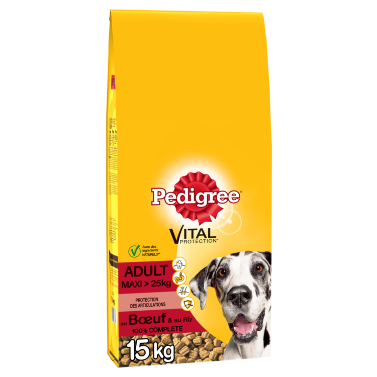 PEDIGREE Croquettes au bœuf pour grand chien adulte 15kg Aliment complet pour chiens adultes de plus de 25 kg - au Boeuf et au Riz. Les croquettes Pedigree® Adult Maxi >25kg offrent à votre chien un repas 100% complet et équilibré, adapté à sa taille et à son âge, avec des ingrédients naturels et sans arôme artificiel ajouté. Les grands chiens mettent leurs articulations à rude épreuve. Ils ont donc besoin d'une attention toute particulière. Pedigree®Adult Maxi contient de la glucosamine et des acides gras oméga-3 issus de sources naturelles, qui aident à maintenir les articulations souples et en bonne santé. Développées avec nos nutritionnistes et nos vétérinaires du Centre de WALTHAM, les croquettes Pedigree® Vital Protection™ sont élaborées pour couvrir nutritionnellement quatre besoins universels du chien; une alimentation pour chien qui aide à maintenir les défenses naturelles, favorise une peau et un pelage sains, contribue à une digestion optimale et nettoyer ses dents.
