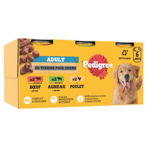Aliment complet pour chiens adultes en terrine - 3 variétés (Avec un mélange de Bœuf et de Foie / Avec un mélange d'Agneau et de Foie / Au poulet). Délicieuses recettes en terrine avec des ingrédients naturels* pour le plus grand plaisir de votre chien. Parfaites pour offrir un savoureux repas préparé à votre chien, les boîtes Pedigree® contribuent à lui apporter une nutrition de qualité pour répondre à tous ses besoins. Élaborée par nos vétérinaires, la pâtée pour chien Pedigree® garantit une alimentation équilibrée, avec des vitamines et des minéraux. Il est important de leur donner une nourriture pour chien spécifique à leurs besoins. Développés avec nos nutritionnistes et nos vétérinaires du Centre de WALTHAM, les boîtes Pedigree ® sont élaborées pour aider votre chien à rester en bonne santé et plein de vitalité.