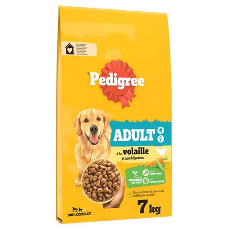 Aliment complet pour chiens adultes - à la Volaille et aux Légumes. Les croquettes Pedigree® Adult offrent à votre chien un repas 100% complet et équilibré, adapté à sa taille et à son âge, avec des ingrédients naturels, des prebiotiques et superaliments, sans arômes ni colorants artificiels ajoutés. Nos croquettes ont une texture spécialement conçue qui aide à nettoyer leurs dents. Nos produits contiennent des fibres naturelles, des prébiotiques, et des protéines de haute qualité, qui contribuent à un bon système digestif. Nos recettes contiennent de la vitamine E, connue pour avoir des fonctions antioxydantes et aider à maintenir les défenses naturelles de votre chien. Avec des vitamines B sélectionnées et du zinc pour l'aider à rester au mieux de sa beauté et de sa forme. Il est important de leur donner une alimentation spécifique à leurs besoins. Développées avec nos nutritionnistes et nos vétérinaires du Centre de WALTHAM, les croquettes Pedigree® sont élaborées pour couvrir nutritionnellement quatre besoins universels du chien; une alimentation pour chien qui aide à maintenir les défenses naturelles, favorise une peau et un pelage sains, contribue à une digestion optimale et aident à nettoyer ses dents.