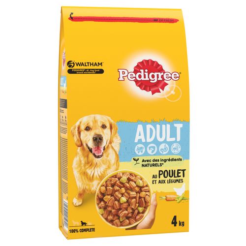 Aliment complet pour chiens adultes - au Poulet et aux Légumes. Les croquettes Pedigree® Adult offrent à votre chien un repas 100% complet et équilibré, adapté à sa taille et à son âge, avec des ingrédients naturels et sans arôme artificiel ajouté. Il est important de leur donner une alimentation spécifique à leurs besoins. Développées avec nos nutritionnistes et nos vétérinaires du Centre de WALTHAM, les croquettes Pedigree® Vital Protection™ sont élaborées pour couvrir nutritionnellement quatre besoins universels du chien; une alimentation pour chien qui aide à maintenir les défenses naturelles, favorise une peau et un pelage sains, contribue à une digestion optimale et à nettoyer ses dents.