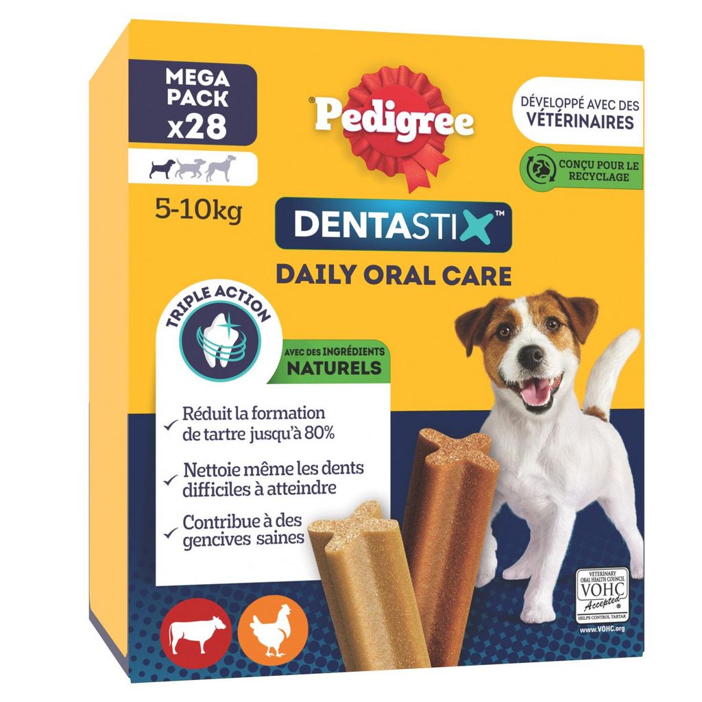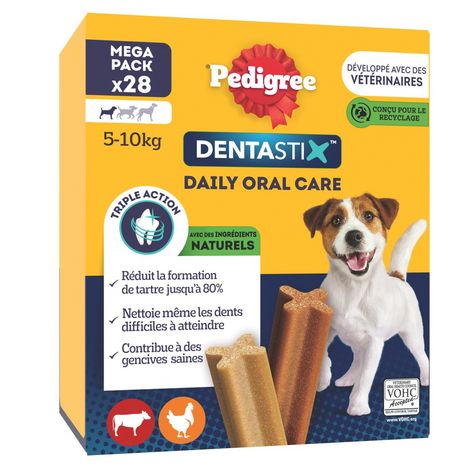 Aliment complémentaire pour chiens de petite taille <10kg ( type Teckel) et jeunes chiens à partir de 4 mois. Les bâtonnets à mâcher Pedigree® Dentastix™ vous aident à garder les dents de votre chien saines et des gencives fortes. Technologie de bâtonnet unique brevetée. En utilisation quotidienne, ce stick dentaire en forme de X unique aide à réduire jusqu'à 80% la formation de tartre. Avec une texture légèrement abrasive conçue pour permettre un frottement sur les dents et des ingrédients actifs qui agissent directement sur la salive qui aide à réduire la formation du tartre. Ces bâtonnets nettoient les dents difficiles à atteindre et contribuent à des gencives saines. Le stick pour chien Pedigree® Dentastix™ est également faible en matières grasses, sans sucres ajoutés, sans colorant ni arôme artificiels. Les délicieuses friandises Pedigree® Dentastix™ s'intègrent parfaitement dans l'équilibre nutritionnel quotidien des chiens grâce à son faible apport en calories. 4 chiens sur 5 de plus de 3 ans ont des problèmes bucco-dentaires. Ils sont causés par le développement de la plaque dentaire et du tartre. Une bonne hygiène bucco-dentaire représente le meilleur moyen de les réduire. 77% des vétérinaires reconnaissent les sticks dentaire comme un bon outil en hygiène bucco-dentaire. Il est scientifiquement prouvé que les bâtonnets à mâcher Pedigree® Dentastix™ vous aident à garder les dents et les gencives de votre chien en bonne santé. Les friandises pour chien Pedigree® Dentastix™ sont disponibles en différentes tailles (chiot de plus de 4 mois/petit, moyen et grand) pour s'adapter à tous les chiens. Friandise pour chien mise au point avec nos nutritionnistes et nos vétérinaires du centre de recherche WALTHAM® - Principale référence mondiale pour la nutrition et le bien-être des animaux de compagnie.
