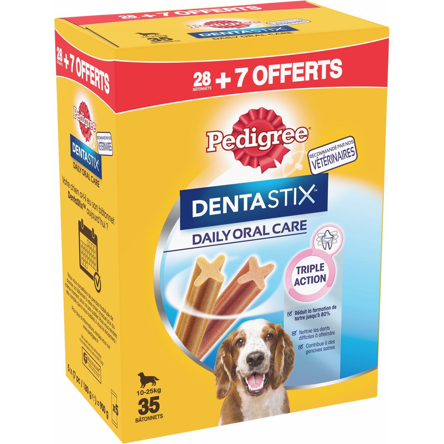 Aliment complémentaire pour chiens de taille moyenne 10-25 kg ( type Cocker Spaniel) et jeunes chiens à partir de 4 mois. Les bâtonnets à mâcher Pedigree® Dentastix™ vous aident à garder les dents de votre chien saines et des gencives fortes. Technologie de bâtonnet unique brevetée. En utilisation quotidienne, ce stick dentaire en forme de X unique aide à réduire jusqu'à 80% la formation de tartre. Avec une texture légèrement abrasive conçue pour permettre un frottement sur les dents et des ingrédients actifs qui agissent directement sur la salive qui aide à réduire la formation du tartre. Ces bâtonnets nettoient les dents difficiles à atteindre et contribuent à des gencives saines. Le stick pour chien Pedigree® Dentastix™ est également faible en matières grasses, sans sucres ajoutés, sans colorant ni arôme artificiels. Les délicieuses friandises Pedigree® Dentastix™ s’intègrent parfaitement dans l’équilibre nutritionnel quotidien des chiens grâce à son faible apport en calories. 4 chiens sur 5 de plus de 3 ans ont des problèmes bucco-dentaires. Ils sont causés par le développement de la plaque dentaire et du tartre. Une bonne hygiène bucco-dentaire représente le meilleur moyen de les réduire. 77% des vétérinaires reconnaissent les sticks dentaire comme un bon outil en hygiène bucco-dentaire. Il est scientifiquement prouvé que les bâtonnets à mâcher Pedigree® Dentastix™ vous aident à garder les dents et les gencives de votre chien en bonne santé. Les friandises pour chien Pedigree® Dentastix™ sont disponibles en différentes tailles (chiot de plus de 4 mois/petit, moyen et grand) pour s’adapter à tous les chiens. Friandise pour chien mise au point avec nos nutritionnistes et nos vétérinaires du centre de recherche WALTHAM® - Principale référence mondiale pour la nutrition et le bien-être des animaux de compagnie. PEDIGREE Dentastix Bâtonnets à mâcher pour moyen chien 35 sticks - 28+7 gratuits