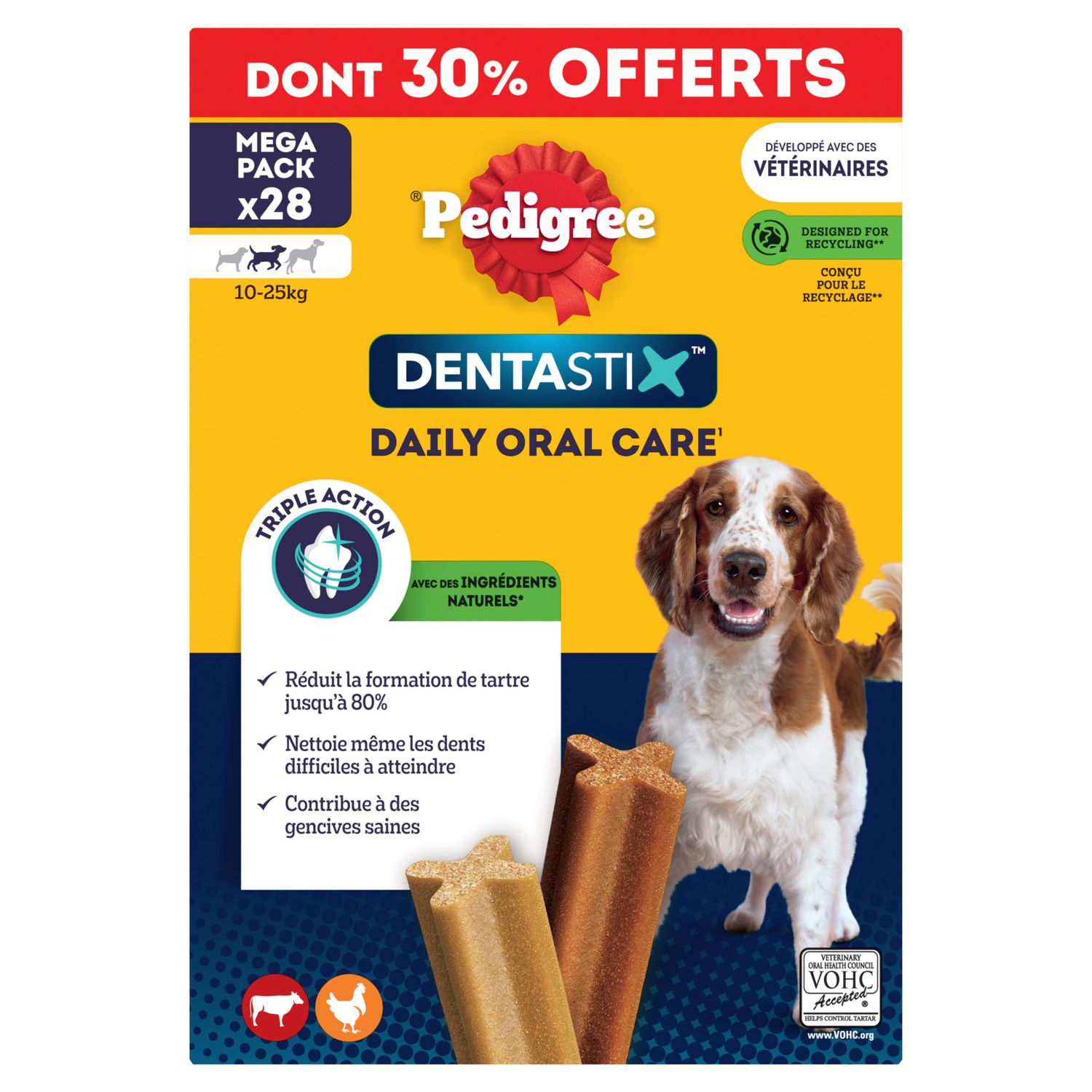 Aliment complémentaire pour chiens de taille moyenne 10-25 kg ( type Cocker Spaniel) et jeunes chiens à partir de 4 mois. Les bâtonnets à mâcher Pedigree® Dentastix™ vous aident à garder les dents de votre chien saines et des gencives fortes. Technologie de bâtonnet unique brevetée. En utilisation quotidienne, ce stick dentaire en forme de X unique aide à réduire jusqu'à 80% la formation de tartre. Avec une texture légèrement abrasive conçue pour permettre un frottement sur les dents et des ingrédients actifs qui agissent directement sur la salive qui aide à réduire la formation du tartre. Ces bâtonnets nettoient les dents difficiles à atteindre et contribuent à des gencives saines. Le stick pour chien Pedigree® Dentastix™ est également faible en matières grasses, sans sucres ajoutés, sans colorant ni arôme artificiels. Les délicieuses friandises Pedigree® Dentastix™ s'intègrent parfaitement dans l'équilibre nutritionnel quotidien des chiens grâce à son faible apport en calories. 4 chiens sur 5 de plus de 3 ans ont des problèmes bucco-dentaires. Ils sont causés par le développement de la plaque dentaire et du tartre. Une bonne hygiène bucco-dentaire représente le meilleur moyen de les réduire. 77% des vétérinaires reconnaissent les sticks dentaire comme un bon outil en hygiène bucco-dentaire. Il est scientifiquement prouvé que les bâtonnets à mâcher Pedigree® Dentastix™ vous aident à garder les dents et les gencives de votre chien en bonne santé. Les friandises pour chien Pedigree® Dentastix™ sont disponibles en différentes tailles (chiot de plus de 4 mois/petit, moyen et grand) pour s'adapter à tous les chiens. Friandise pour chien mise au point avec nos nutritionnistes et nos vétérinaires du centre de recherche WALTHAM® - Principale référence mondiale pour la nutrition et le bien-être des animaux de compagnie.