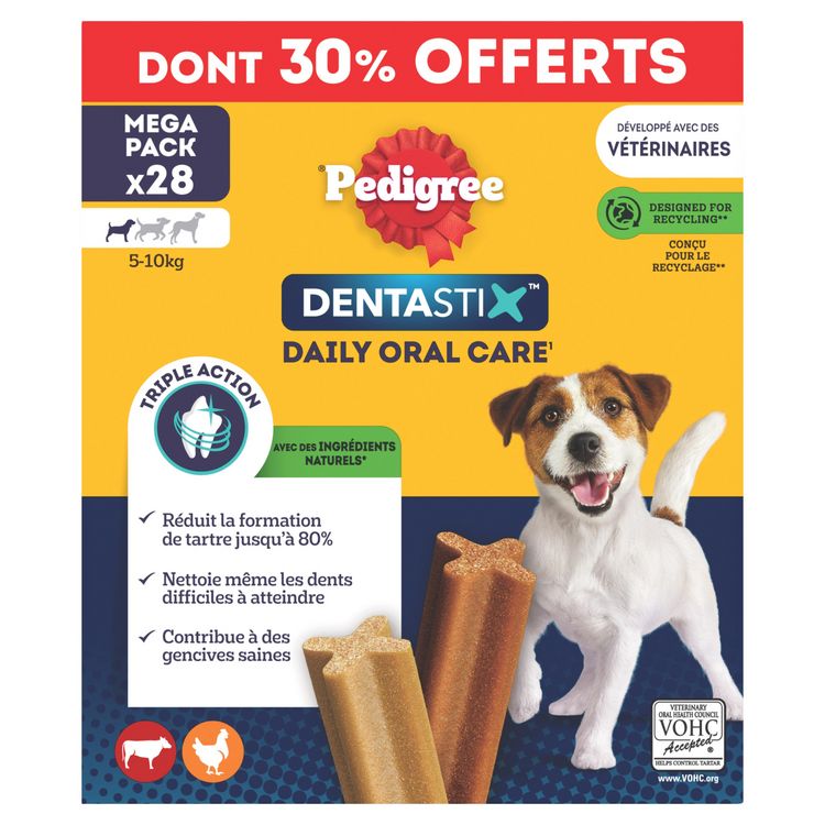 Aliment complémentaire pour chiens de petite taille <10kg ( type Teckel) et jeunes chiens à partir de 4 mois. Les bâtonnets à mâcher Pedigree® Dentastix™ vous aident à garder les dents de votre chien saines et des gencives fortes. Technologie de bâtonnet unique brevetée. En utilisation quotidienne, ce stick dentaire en forme de X unique aide à réduire jusqu'à 80% la formation de tartre. Avec une texture légèrement abrasive conçue pour permettre un frottement sur les dents et des ingrédients actifs qui agissent directement sur la salive qui aide à réduire la formation du tartre. Ces bâtonnets nettoient les dents difficiles à atteindre et contribuent à des gencives saines. Le stick pour chien Pedigree® Dentastix™ est également faible en matières grasses, sans sucres ajoutés, sans colorant ni arôme artificiels. Les délicieuses friandises Pedigree® Dentastix™ s'intègrent parfaitement dans l'équilibre nutritionnel quotidien des chiens grâce à son faible apport en calories. 4 chiens sur 5 de plus de 3 ans ont des problèmes bucco-dentaires. Ils sont causés par le développement de la plaque dentaire et du tartre. Une bonne hygiène bucco-dentaire représente le meilleur moyen de les réduire. 77% des vétérinaires reconnaissent les sticks dentaire comme un bon outil en hygiène bucco-dentaire. Il est scientifiquement prouvé que les bâtonnets à mâcher Pedigree® Dentastix™ vous aident à garder les dents et les gencives de votre chien en bonne santé. Les friandises pour chien Pedigree® Dentastix™ sont disponibles en différentes tailles (chiot de plus de 4 mois/petit, moyen et grand) pour s'adapter à tous les chiens. Friandise pour chien mise au point avec nos nutritionnistes et nos vétérinaires du centre de recherche WALTHAM® - Principale référence mondiale pour la nutrition et le bien-être des animaux de compagnie.