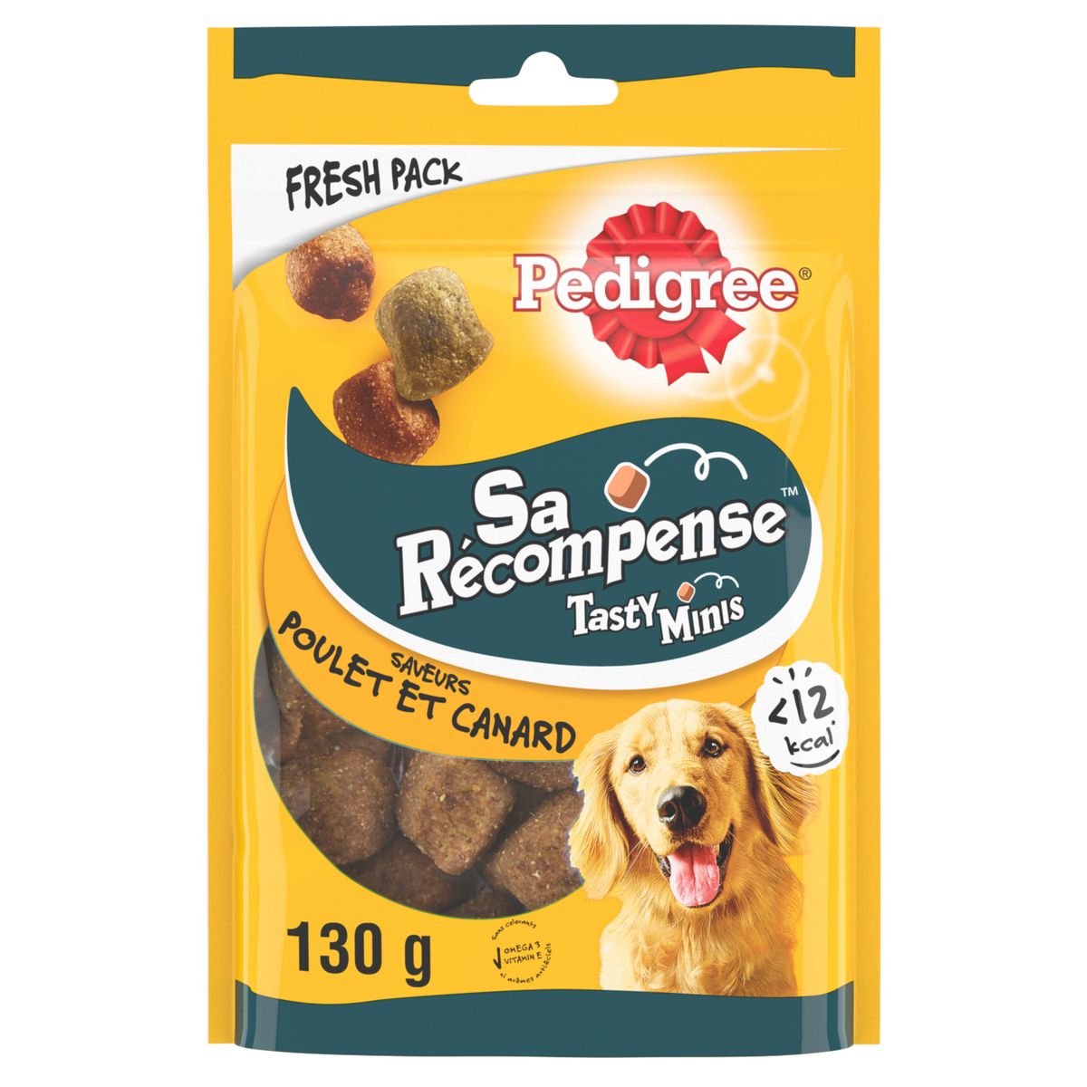 Les friandises pour chien PEDIGREE® Sa Récompense™ / Tasty Minis saveurs poulet et canard sont disponibles en format sachet refermable de 130 g.