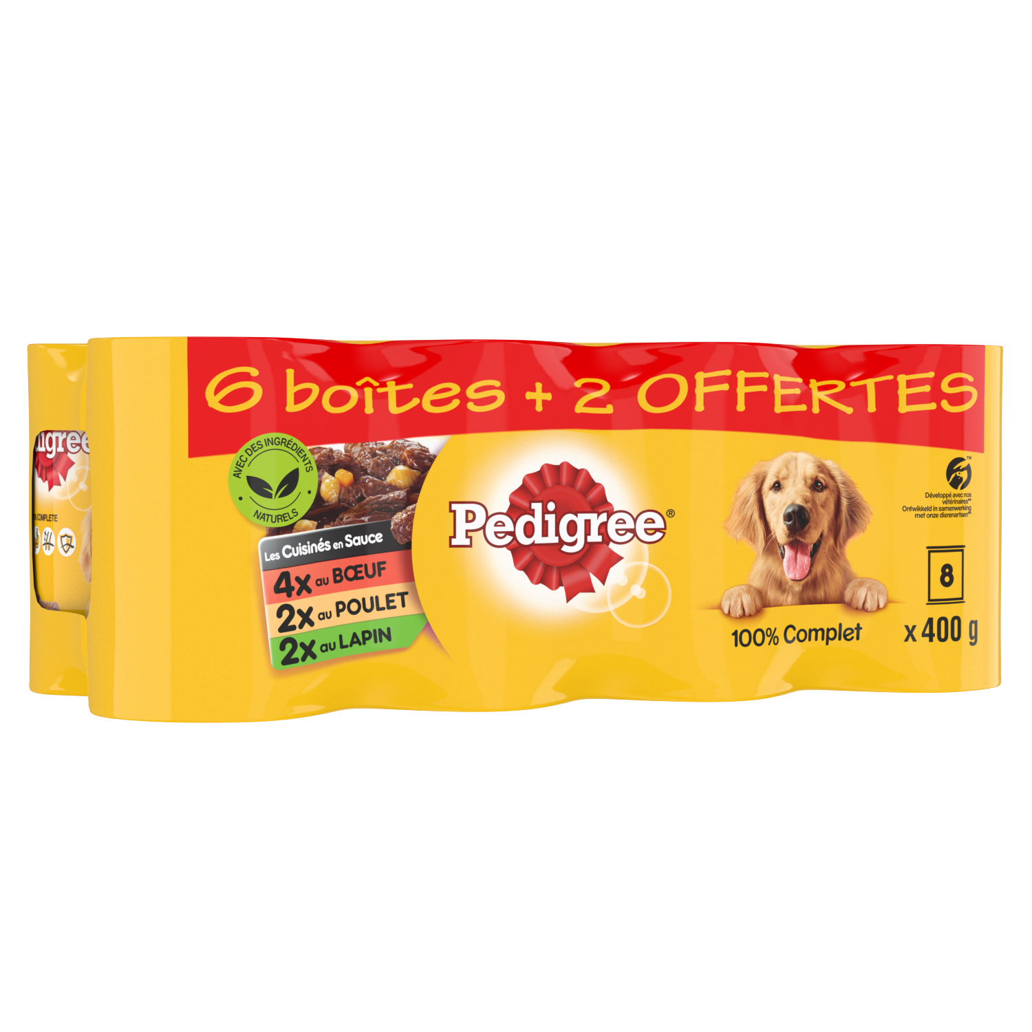 Les boîtes Pedigree® Les Cuisinés en sauce pour chien sont disponibles en format promo 6x400g + 2 boîtes offertes.