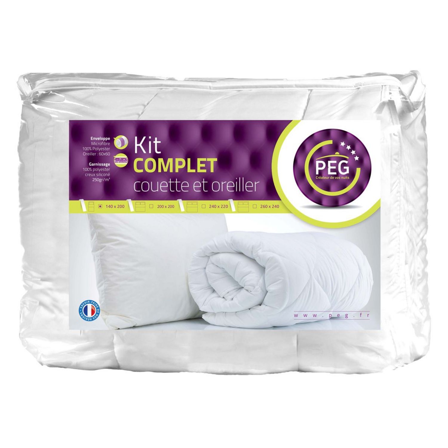 Pack couette 250 g/m² + oreiller(s) moelleux polyester, c'est le pack complet ! Fabriqué en France.