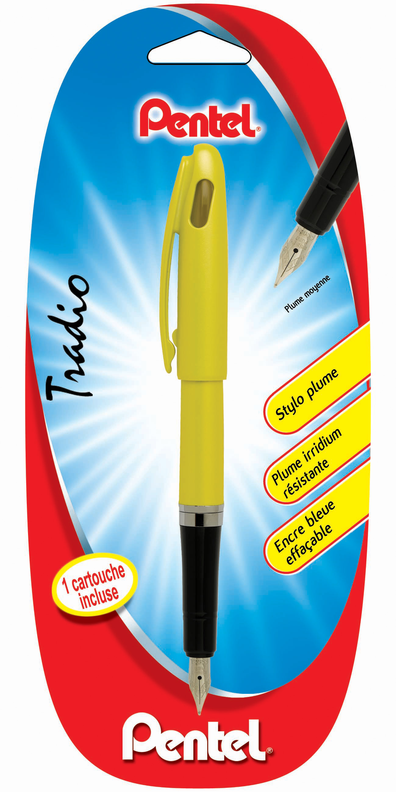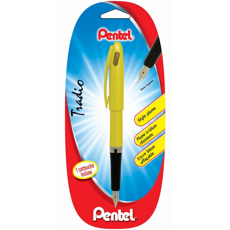 Stylo plume métal rechargeable TRADIO, plume medium en iridium argent, corps couleur funny, encre bleue effaçable. Utilise des cartouches universelles longues ou courtes.