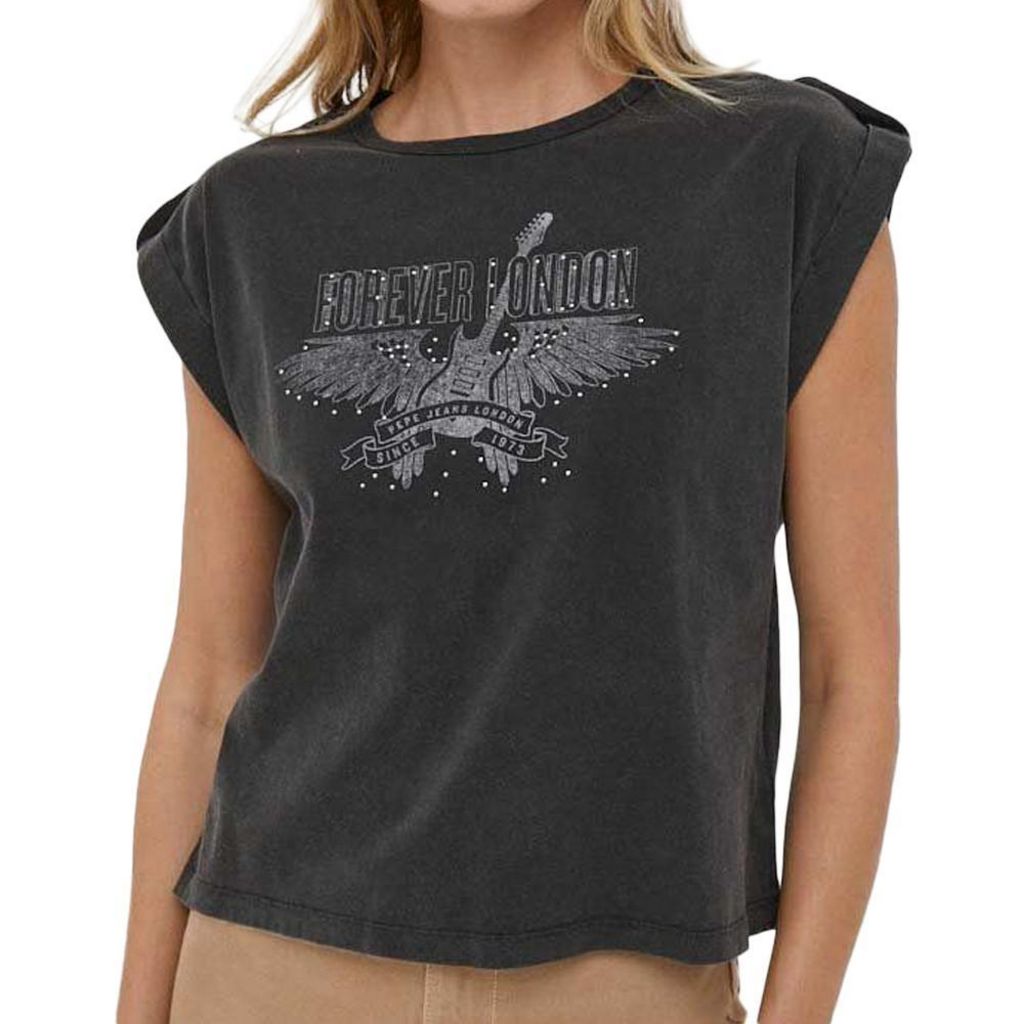T-shirt femme de la marque Pepe JeansManches courtesCol rondColoris : NoirImprimé sur l'avant avec rivetsComposition : 100% coton
