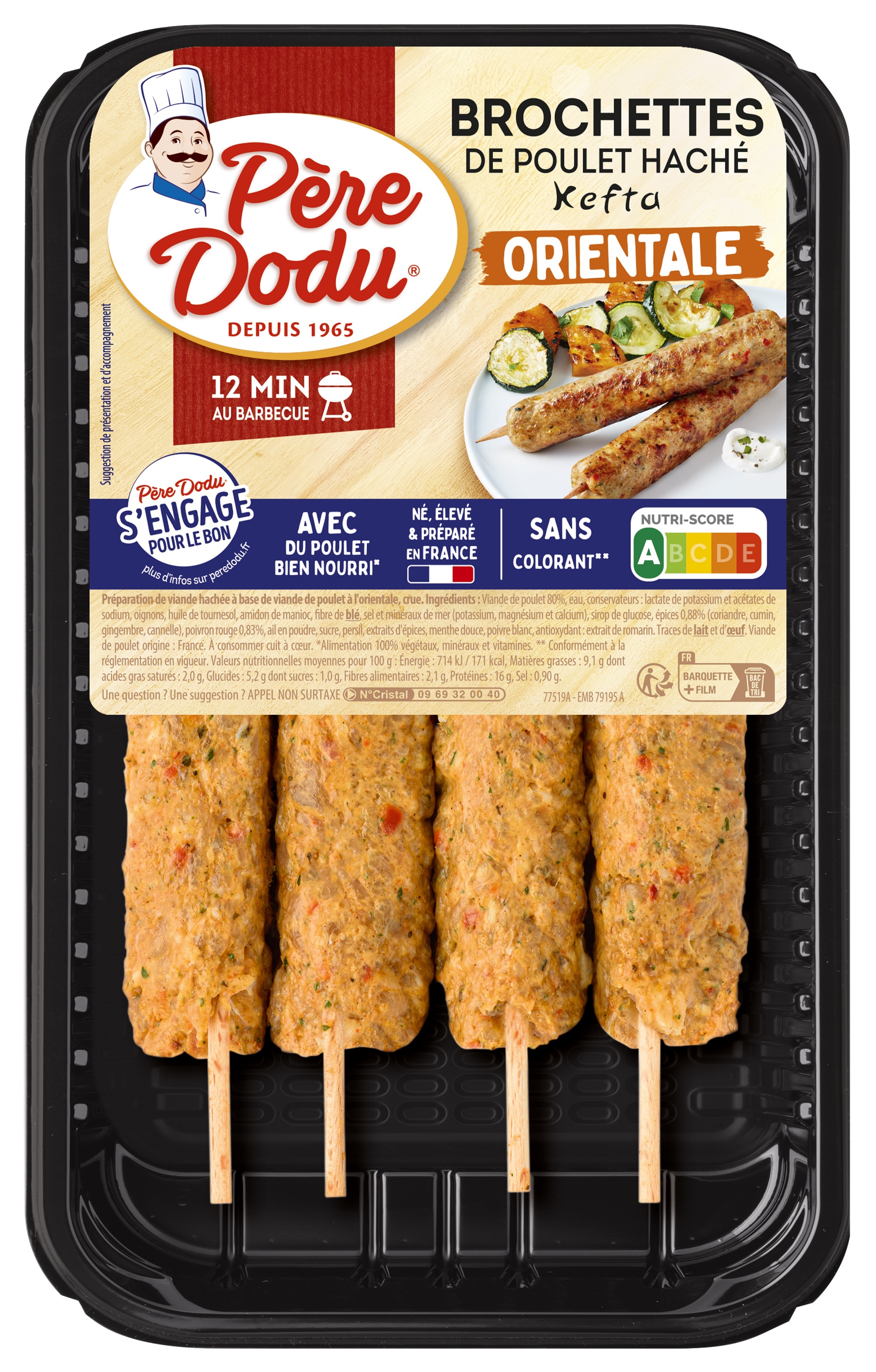 Ingrédients : Viande de poulet 80%, eau, conservateurs : lactate de potassium et acétates de sodium, huile de tournesol, oignons, fécule de manioc, fibre de blé, sel, sirop de glucose, poivron rouge (0,87%), épices (0,87%) sucre, poudre d'oignons, poudre d'ail, persil, extrait d'oignons, menthe douce (0,05%), extraits d'épices, poivre blanc. Traces de lait et ½uf. Viande de poulet origine : France.