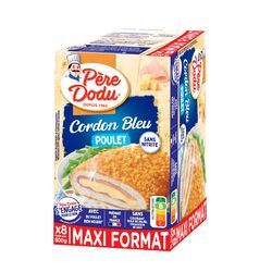 Le Cordon Bleu Père Dodu : une tendre viande de poulet, agrémentée de fromage fondant et d¿un savoureux jambon fumé de dinde sans nitrite, le tout enrobé d¿une chapelure croustillante.La garantie d¿un plat gourmand et facile qui plaît aux petits et aux grands !