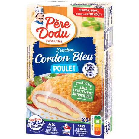 Ingrédients : Ingrédients (à la mise en oeuvre): Filets de poulet 40,8%, eau, farine de BLE, viande de dinde 11%, FROMAGES, amidons modifiés, arômes* (CELERI), dextrose, sel, protéines de BLE, protéines de LAIT, BEURRE, fibres de BLE, LAIT écrémé en poudre, levure, sel de fonte: citrate de sodium, épices, antioxydant: acide ascorbique, conservateur: sorbate de potassium. Huile de tournesol. * contient naturellement des polyphénols. Traces éventuelles de: oeufs et autres céréales contenant du gluten. Viande origine France. PRODUIT CONDITIONNE SOUS ATMOSPHERE PROTECTRICE.