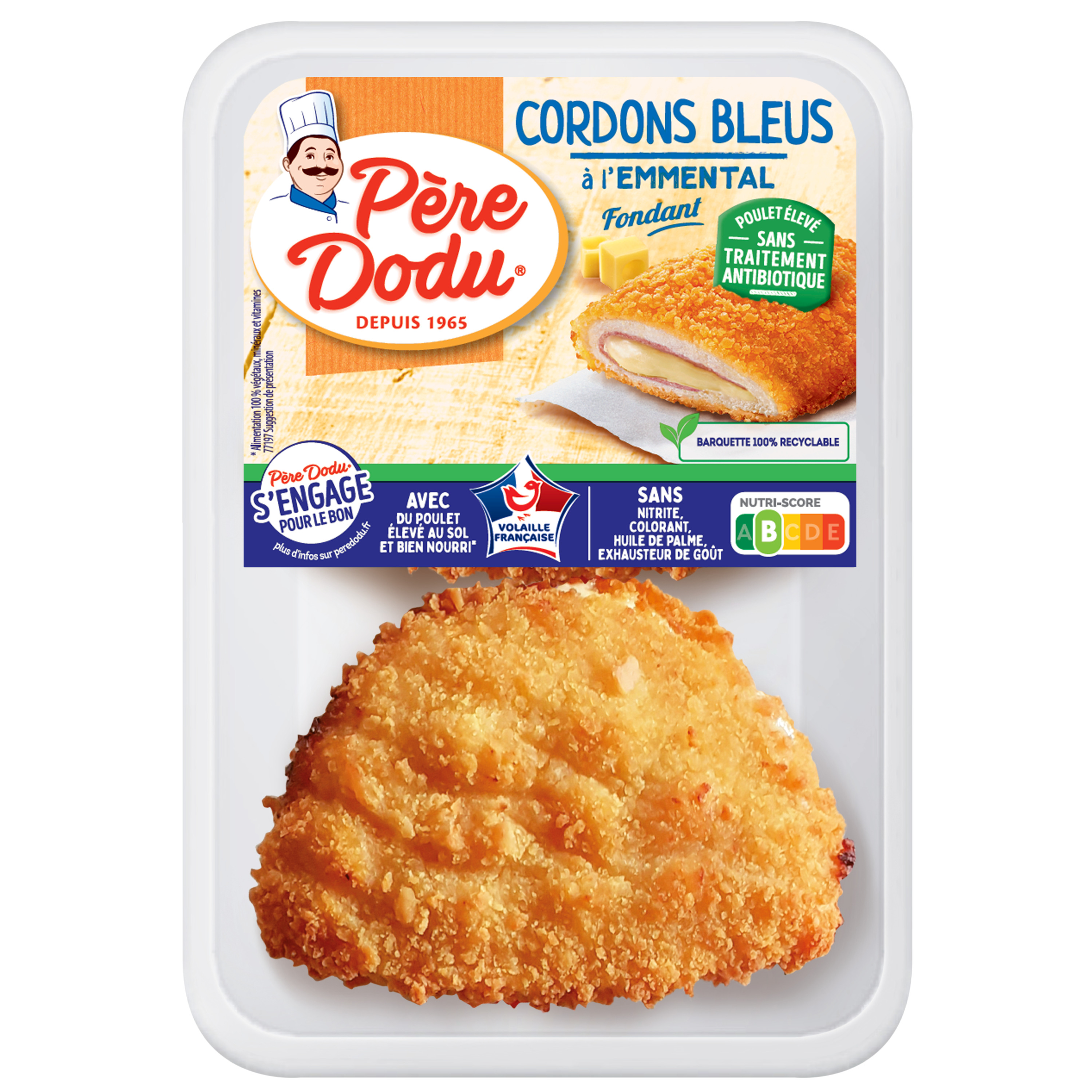 Ingrédients : Ingrédients (a la mise en oeuvre) :viande de poulet (origine : France) 38%, eau, farine de BLE, viande de dinde (origine : France) 9,8%, FROMAGE fondu (dont EMMENTAL 2,2%), arômes*, fibre de BLE, dextrose, gluten de BLE, BEURRE, amidons modifiés de pomme de terre et de maïs, LACTOSERUM, LAIT écrémé en poudre, sel, sel de fonte : citrate de sodium, gélifiant : carraghénane, épice, antioxydant : acide ascorbique. Huile de tournesol. * contient naturellement des polyphénols. Traces éventuelles d'oeuf et d'autres céréales contenant du gluten.