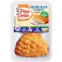 Préparation à base de viande de poulet traitée en salaison 50 %, garnie d'une tranche de jambon de dinde cuit standard au goût fumé 13 % et de fromage fondu 10 %, panée 27 % et cuite