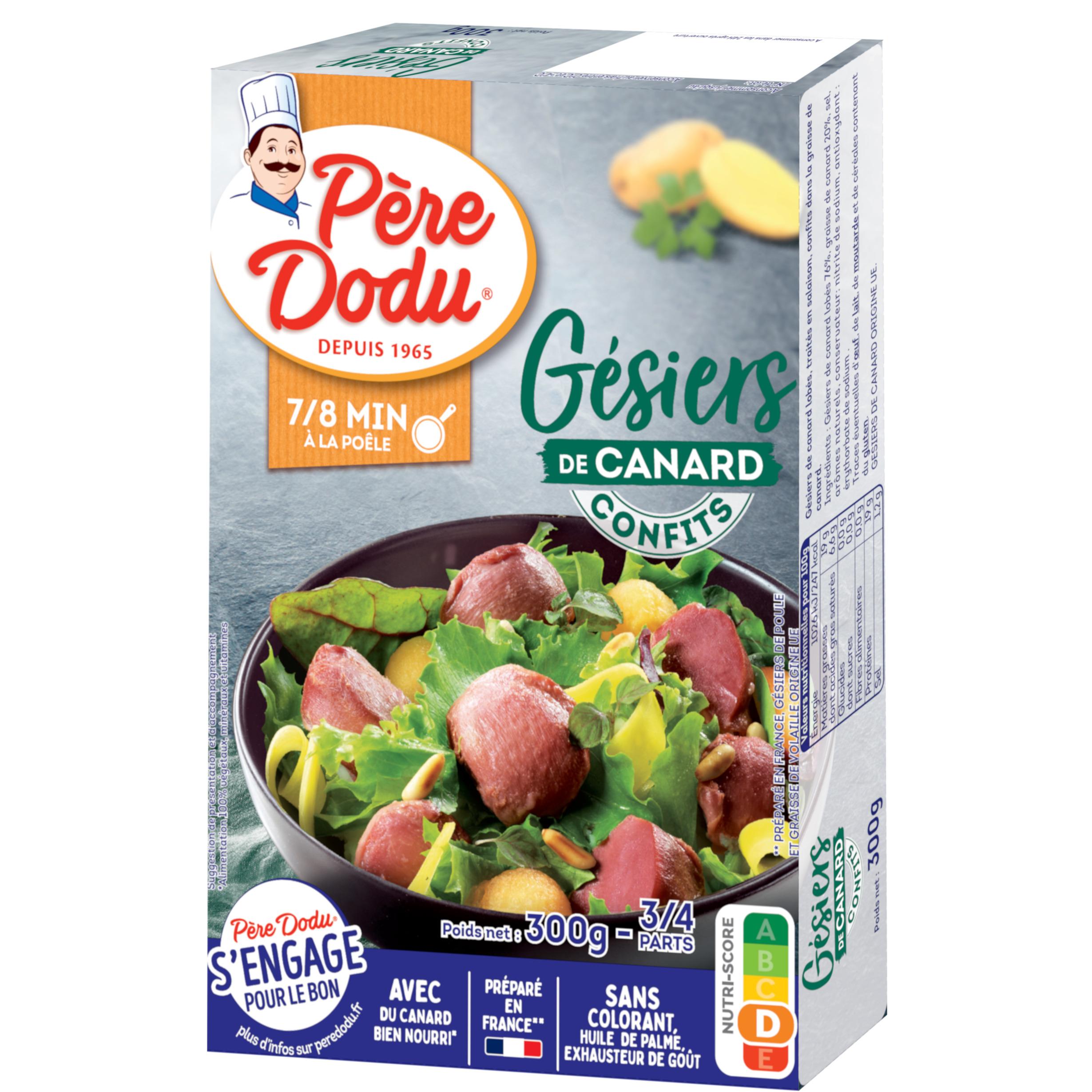 Nos gésiers de canard sont cuisinés lentement en confit. C''est grâce à ce savoir-faire que Père Dodu peut en préserver la saveur et le fondant. Il n''y a plus qu''à inventer des salades gourmandes aux Gésiers Confits, qui feront plaisir à tous.