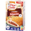 Préparation à base de viande de filets de poulet traités en salaison, reconstitués 50%, garnie d''une sauce bolognaise 25%, panée 25% et cuite